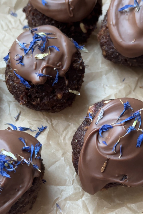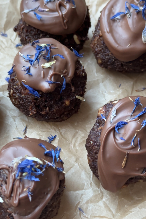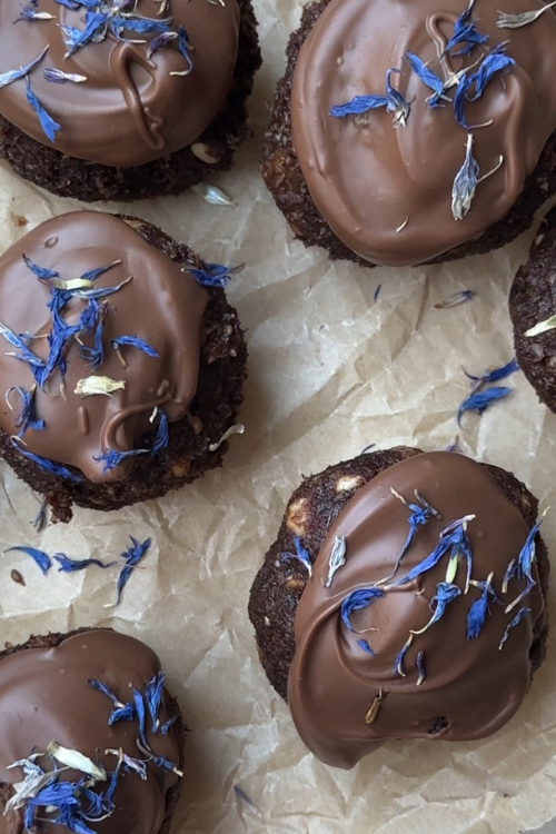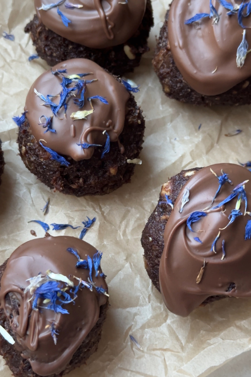 Uformuj 8 kulek. Polej je roztopioną czekoladą, posyp płatkami bławatka i wstaw do lodówki na 2-3 godziny.