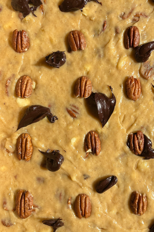 Do wystudzonej masy dodaj jaja, mąkę, szczyptę soli, pokrojoną czekoladę i orzechy pekan. Wymieszaj całość szpatułką do połączenia składników i przełóż do foremki wyłożonej papierem do pieczenia. Na wierzch nałóż kleksy z kremu o smaku gorzkiej czekolady i ozdób orzechami pekan.