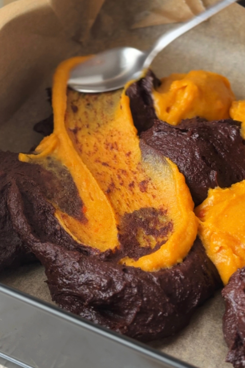 Układaj łyżkami na przemian masę dyniową i czekoladową. Rozprowadź tworząc szlaczki.