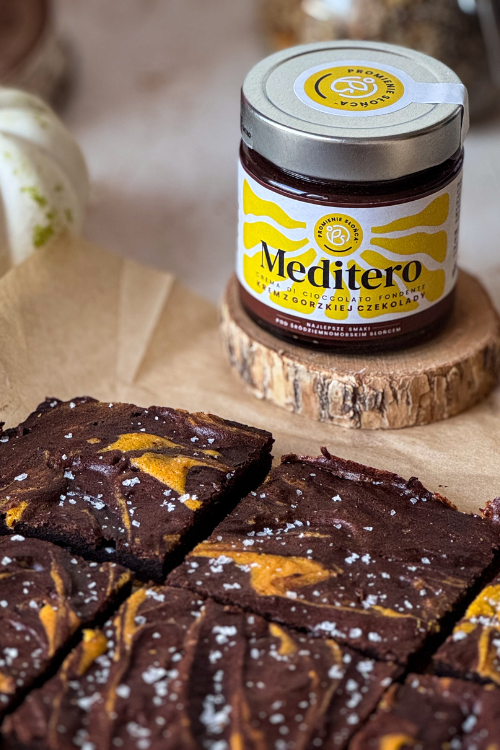 Ostudź całkowicie w formie. Po upieczeniu posyp solą i dodaj rozpuszczony czekoladowy krem Meditero od Promieni Słońca.