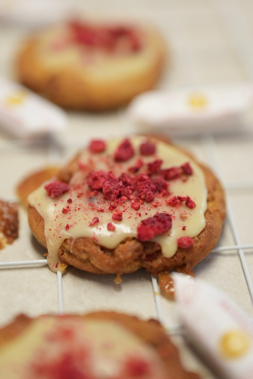 Gdy ciastka wystygną, polej je roztopioną białą czekoladą (możesz dodać odrobinę mleka) i posyp malinami liofilizowanymi.