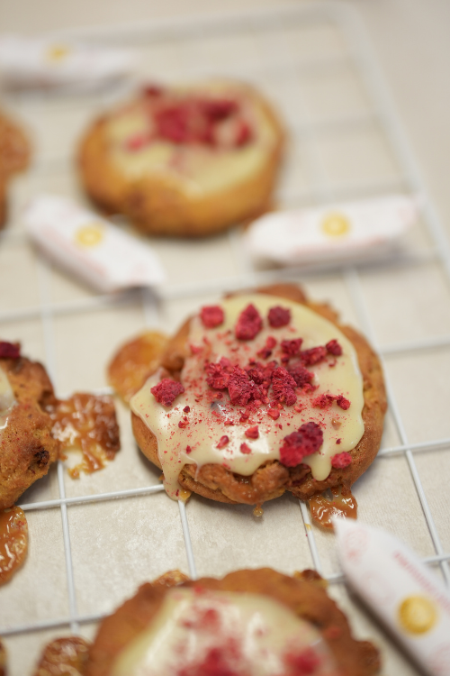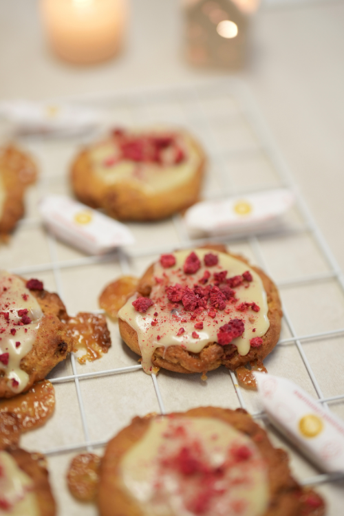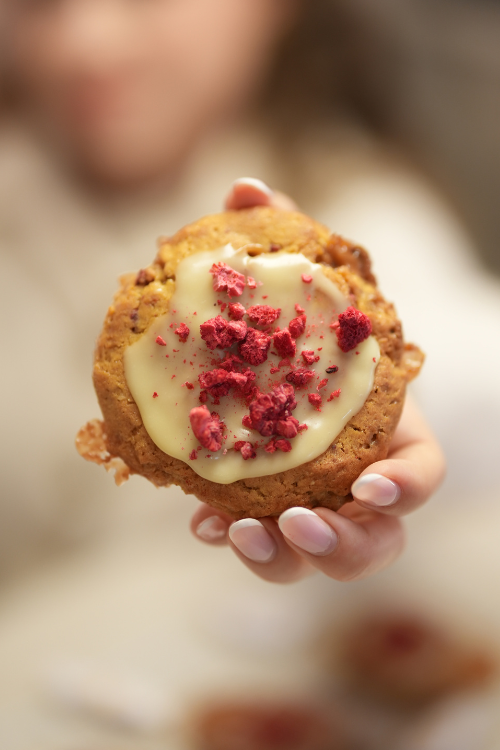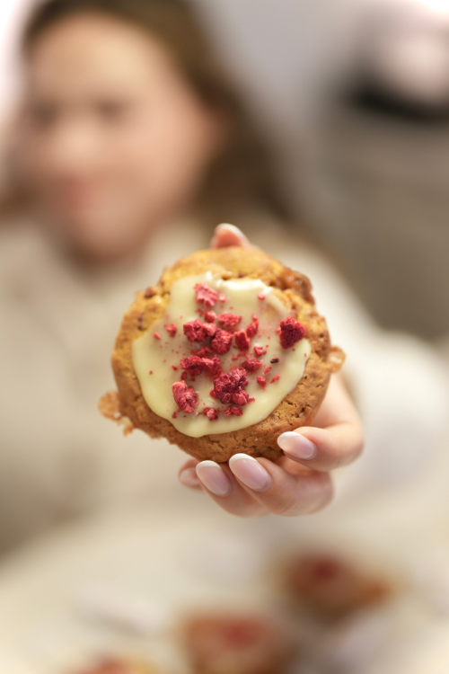 „Zrobienie ciasteczek z mąki z ciecierzycy to było moje małe wyzwanie. Chciałam udowodnić, że da się zrobić coś pysznego, co ma przy okazji trochę więcej białka! Połączyłam mąkę z ciecierzycy z krówkami malinowymi, białą czekoladą i liofilizowaną maliną… i wyszło coś totalnie wyjątkowego 🤍🍓