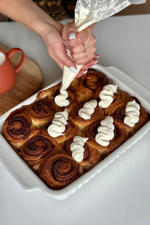 Ostudzone zawijasy cynamonowe dekorujemy wcześniej przygotowaną przykrywką śmietankową.