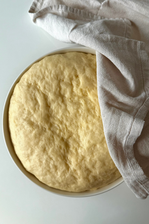 Do zaczynu dodajemy pozostałe składniki (jajka, cukier, mąkę i sól) i wyrabiamy jednolite ciasto przez 6-8 min. Odstawiamy pod przykryciem w ciepłym miejscu na 1.5h do wyrośnięcia.