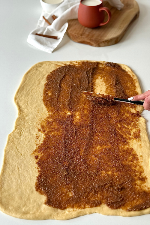 Wyrośnięte ciasto rozwałkowujemy na dużej wielkości prostokąt i smarujemy nadzieniem pozostawiając jeden, najdłuższy bok niedosmarowany, aby rulon dobrze się skleił. Zwijamy ciasto rozpoczynając od dłuższej strony. Kroimy je na 12 bułeczek i układamy w brytfance. Odstawiamy pod przykryciem na pół godziny do wyrośnięcia.