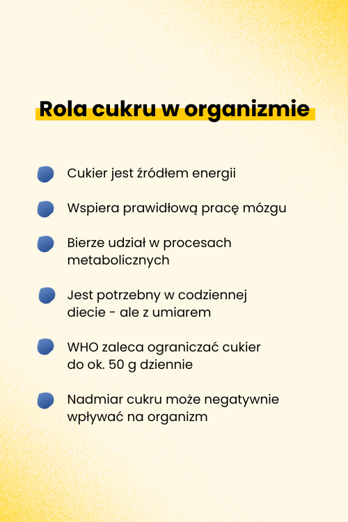 Chociaż spożywanie cukru ma wiele negatywnych cukrów, nie oszukamy naszej natury. Jest on ważnym elementem w diecie i odgrywa swoją rolę, tak samo jak białko czy błonnik. Cukier to nośnik energii i jest on niezbędny do prawidłowej pracy mózgu. Przyczynia się też regulacji procesów metabolicznych, a wraz z białkami i tłuszczami wchodzi w skład struktur komórkowych.