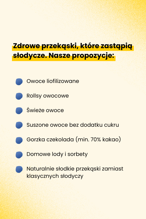 Niektóre słodkie produkty, takie jak miód, syrop klonowy czy syrop daktylowy są uważane za zdrowszy cukier. Poza samą słodyczą oferują one nam też inne korzyści, na przykład syrop klonowy jest źródłem witamin, minerałów i przeciwutleniaczy. Cukry można zastąpić słodzikami, przykładowo erytrytolem, ale one także przy zbyt dużej ilości mogą nieść negatywne skutki. Po jakie przekąski sięgnąć można sięgnąć, zamiast zwykłe słodycze? Oto kilka naszych propozycji: