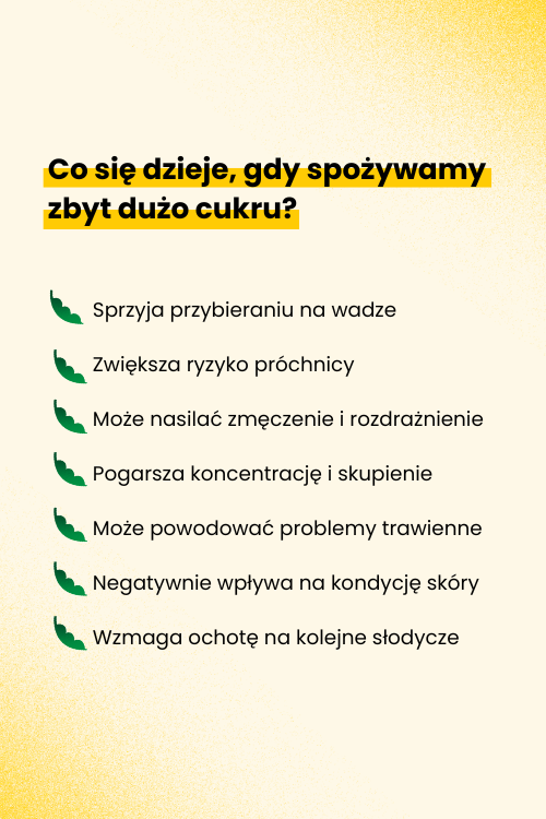 Zbyt duża ilość cukru w diecie może doprowadzić do wielu negatywnych skutków. Najbardziej typowymi jest wzrost masy ciała oraz próchnica i ubytki w uzębieniu. To właśnie w ten sposób zazwyczaj mamy “straszyły nas”, gdy chcieliśmy, żeby kupiły nam w sklepie te piękne błyszczące landrynki. Nadużywanie cukru może mieć jeszcze więcej niekorzystnych efektów: doprowadzać do problemów z zasypianiem i snem, zwiększać rozdrażnienie, jednocześnie zmniejszać energię i zwiększać zmęczenie. Im częściej sięgamy po produkty z dodatkiem cukru, tym bardziej mamy na niego ochotę, a zwykłe posiłki, które go nie zawierają, nie smakują nam aż tak, chcemy sięgać po więcej słodkiej żywności, co może doprowadzić do groźnego uzależnienia od cukru.
