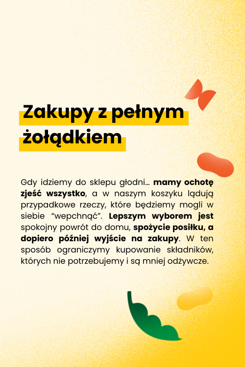 Szybkie zakupy po pracy, to bardzo dobrze znany schemat. Niestety zazwyczaj jesteśmy wtedy głodni, a gdy idziemy do sklepu głodni… mamy ochotę zjeść wszystko, a w naszym koszyku lądują przypadkowe rzeczy, które będziemy mogli w siebie “wepchnąć”. Lepszym wyborem jest spokojny powrót do domu, spożycie posiłku, a dopiero później wyjście na zakupy. Inną opcją jest zabranie ze sobą nieco większej porcji drugiego śniadania czy obiadu, którą możemy dojeść, na przykład w samochodzie, już po zakończeniu pracy, a potem wyjście do sklepu. W ten sposób ograniczymy kupowanie składników, których nie potrzebujemy i są mniej odżywcze.