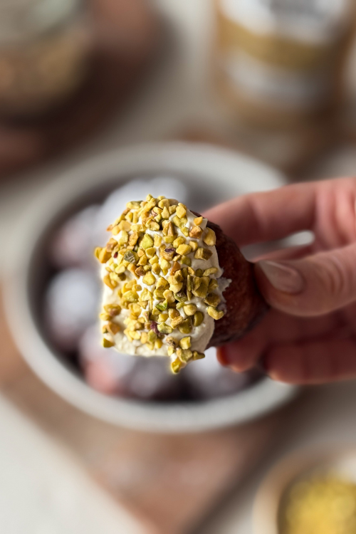Na wystudzone mini pączki nałóż krem pistacjowy i posyp kostką pistacjową.