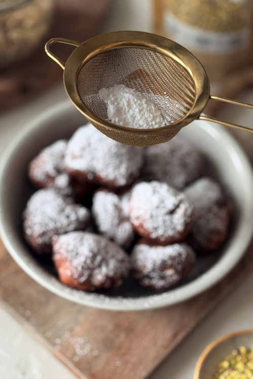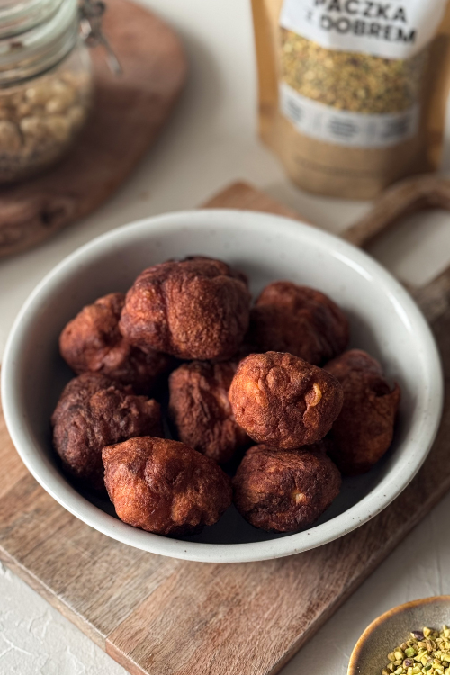 Rozgrzej olej do ok. 165–170°C. Łyżeczką nabieraj porcje ciasta, formuj kulki delikatnie zwilżonymi olejem dłońmi i smaż partiami ok. 6 minut, aż będą rumiane i puszyste.