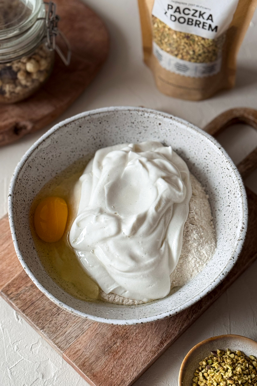 Do miski wsyp mąkę i proszek do pieczenia, dodaj jajko oraz skyr. Wymieszaj łyżką na gładkie, gęste ciasto.