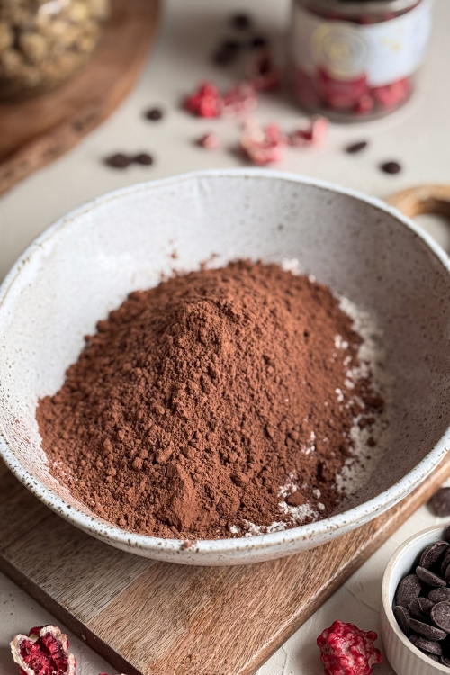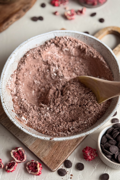 W jednej misce wymieszaj mąkę, kakao, proszek do pieczenia, sodę i sól. Odstaw.