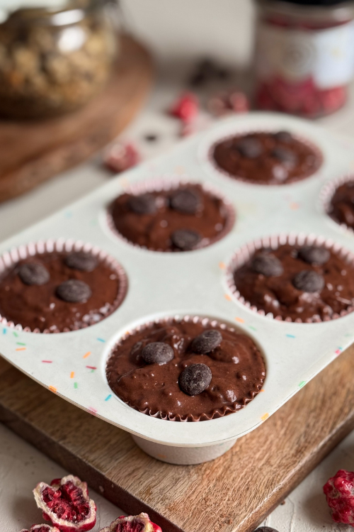 Nałóż ciasto do papilotek prawie do pełna. Dodaj ewentualnie jeszcze troszkę czekolady na górę.