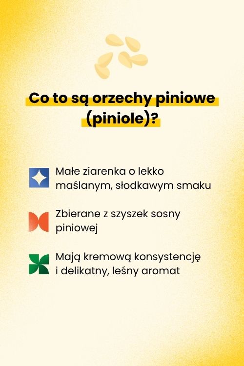 Piniole to nieduże orzeszki. Charakteryzują się przyjemnym, maślanym smakiem z lekko żywicznym, leśnym aromatem. Pochodzą one z szyszek niektórych gatunków sosen wysokich, najczęściej sosny pini, ale też między innymi z sosny Gerardy. Szyszki tych drzew są zbierane ręcznie lub strzepywane z drzew, a następnie suszone. Suszenie sprawia, że łuski szyszek otwierają się, dzięki czemu można łatwo wydobyć nasiona, czyli nasze orzeszki piniowe. Na końcu muszą zostać dokładnie oczyszczone z twardych łusek, abyśmy się mogli cieszyć niedużymi orzeszkami w naszych domach.
