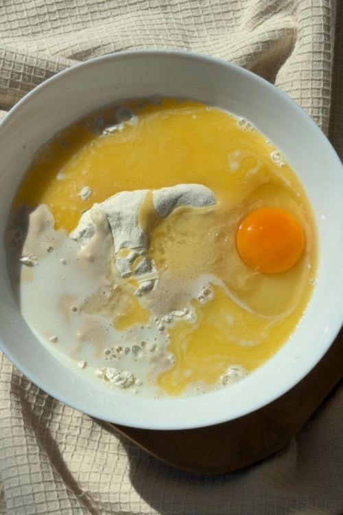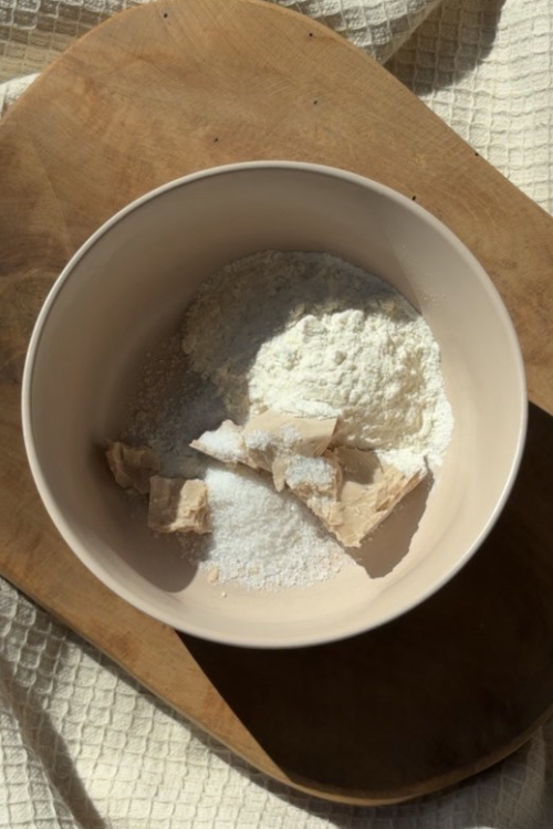 Wymieszaj drożdże z cukrem, mąką i mlekiem. Odstaw na 10–15 minut aż rozczyn ruszy (pojawią się bąbelki).