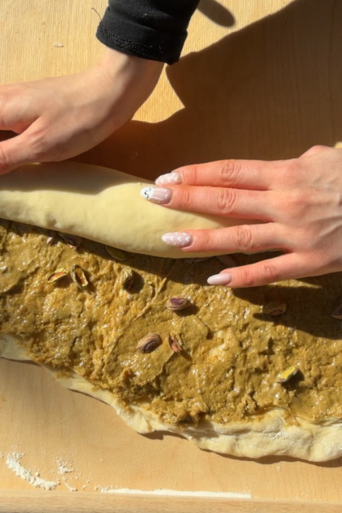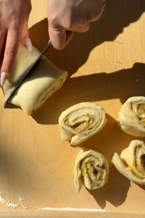 Wyrośnięte ciasto rozwałkuj na prostokąt i rozsmaruj na nim krem pistacjowy, posyp posiekanymi pistacjami i zwiń w roladę. Pokrój na 9 bułeczek.
