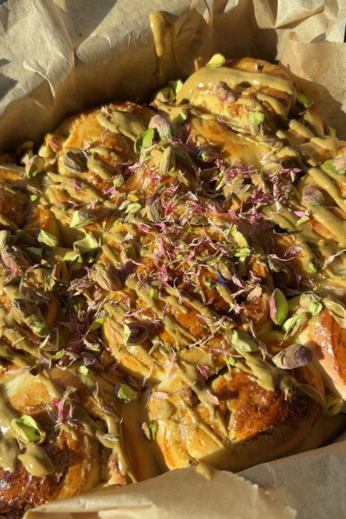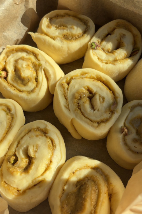 Wyobraź sobie poranek, który zaczyna się zapachem ciasta drożdżowego i kubka gorącej matchy... Pistacjanki to nie są zwykłe drożdżówki - to puszyste, złociste zawijasy z rozpływającym się kremem pistacjowym i chrupiącą posypką, które smakują jeszcze lepiej niż wyglądają. Idealne na śniadanie, na deser, na prezent, albo po prostu wtedy, kiedy masz ochotę na coś wyjątkowego. Gotowy_a na pistacjową rozpustę?
