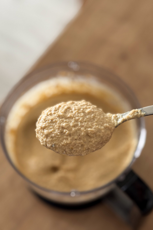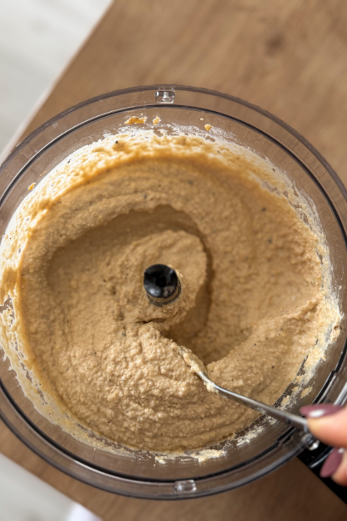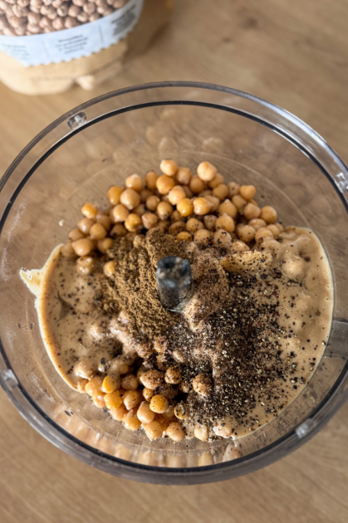 Do blendera dodaj ciecierzycę, tahini, sok z cytryny, sól, kumin, czosnek i opcjonalnie oliwę. Blenduj na gładką masę. W razie potrzeby dodaj 1-3 łyżki zimnej wody, żeby uzyskać idealnie kremową konsystencję.