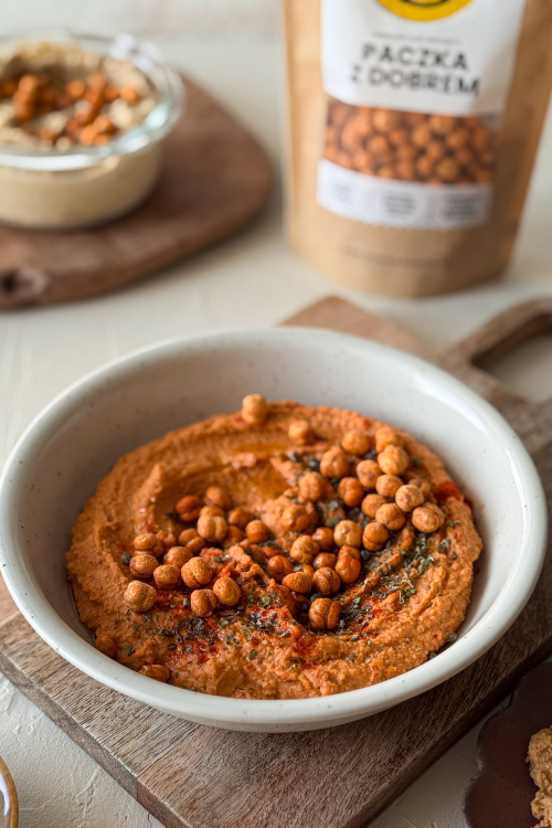 Wersja paprykowa - paprykę szpiczastą upiecz w air fryerze 20 minut w 200°C (aż będzie miękka i lekko przypieczona). Obierz ze skórki i dodaj do hummusu razem z przyprawami i zblenduj ponownie.