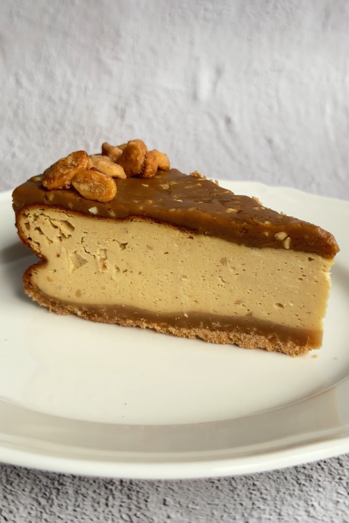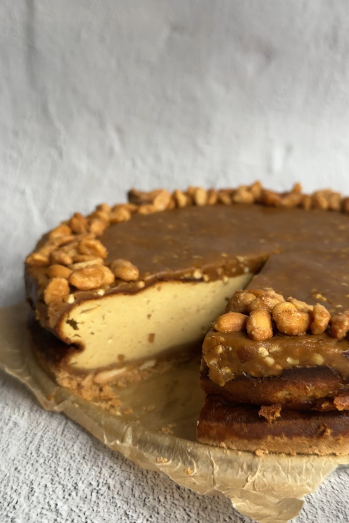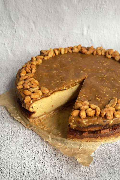 Następnego dnia udekoruj kremem z orzechów arachidowych z dodatkiem słonego karmelu oraz posyp orzechami z dodatkiem słonego karmelu.