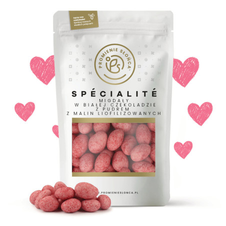 Staramy się, aby nasze produkty miały jak najprostsze składy i zawierały jak najwięcej powszechnie znanych składników. Nasza słodka przekąska to chrupiące orzechy migdałowe, otoczone grubą warstwą pysznej białej czekolady w uroczym różowym kolorze, obtoczone w malinowym pudrze, zrobiony z malin liofilizowanych. Migdały są smaczne i pięknie się prezentują.