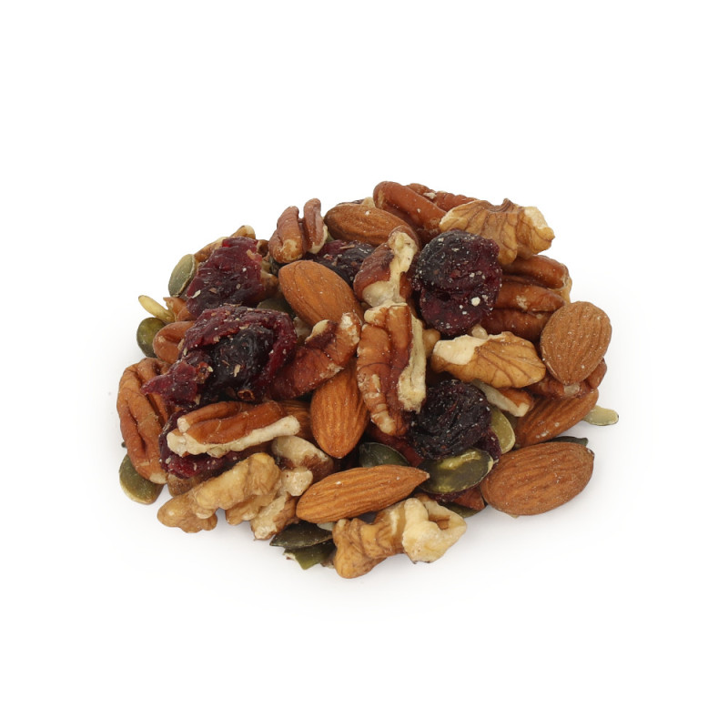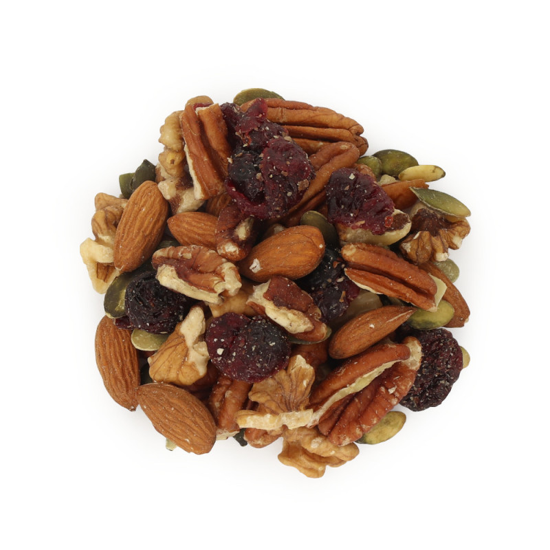 Pestki dyni 20%, migdały 20%, orzechy pekan 20%, żurawina suszona cała 20% (żurawina, cukier, olej słonecznikowy), orzechy włoskie 20%.