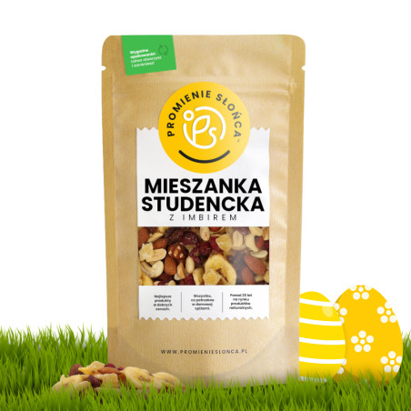 Klasyczna mieszanka studencka to połączenie przepysznych bakalii i owoców suszonych, owoców kandyzowanych oraz orzechów. My naszą mieszankę wzbogaciliśmy o imbir kandyzowany, który idealnie dopełnia jej smak i dodaje składników odżywczych, niezbędnych do prawidłowego funkcjonowania organizmu.