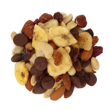 Rodzynki sułtańskie 17,8% (suszone owoce winogron 99,5%-99,7%, olej roślinny 0,3%-0,5% (słonecznikowy), żurawina suszone 7,8% (żurawina suszona 54%-64%, cukier 34%-45%, olej słonecznikowy 1%), orzechy ziemne 17,8% orzechy laskowe 7,8%, orzechy nerkowca 7,8%, migdały 7,8%, chipsy bananowe 17,8% (smażone plastry banana 73%, olej kokosowy 17%, cukier 10%), gorzka czekolada 15% (cukier, miazga kakaowa, tłuszcz kakaowy, emulgator: lecytyna sojowa, aromat waniliowy, emulgator: E476.