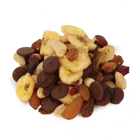 Nasza mieszanka to połączenie najlepszych bakalii i gorzkiej czekolady. Znajdziecie tutaj chipsy bananowe, migdały naturalne, rodzynki sułtańskie, orzechy ziemne prażone, niesolone, orzechy laskowe łuskane, żurawinę suszoną ciętą, orzechy nerkowca połówki oraz czekoladę deserową w pastylkach. Przepyszna, słodka i chrupiąca mieszanka na pewno przypadnie Ci do gustu!