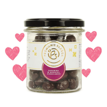 Wyjątkowa żurawina otoczona grubą warstwą kremowej gorzkiej czekolady, zapakowana w ładnym słoiczku to fantastyczna propozycja prezentowa. Z pewnością taki słodki upominek się nie zmarnuje, a może nawet przekona do żurawiny osoby, które na co dzień jej nie lubią.