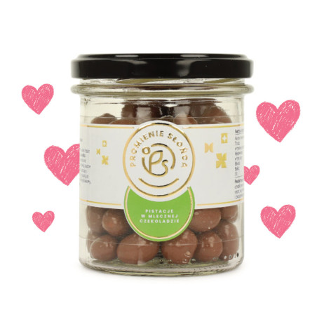 Pistacje w mlecznej czekoladzie w słoiczku to idealny pomysł na upominek dla kogoś bliskiego, czy kiedy nie mamy pomysłu na prezent. Taki słoiczek wypełniony pysznościami na pewno nie pójdzie do kosza i nie zmarnuje się. Chrupiący orzech pistacjowy otoczony przepyszną czekoladą, która rozpływa się w ustach to coś, co uwielbiają nasi klienci!