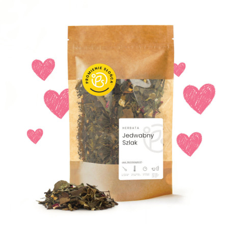 O jedwabnym szlaku słyszał chyba każdy. Był to szlak handlowy łączący ze sobą Europę, Azję oraz Afrykę i funkcjonował przez prawie 2 tysiące lat! Nasza wyjątkowa herbata biała Jedwabny Szlak to wyjątkowe połączenie różnych smaków zamknięte w jednej torebce. Znajdziemy w niej herbatę białą Pai Mu Tan i herbatę zieloną Yunnan Green OP. Owoce brzoskwini i moreli nadają jej delikatnego owocowego smaku. Herbata została wzbogacona pączkami jaśminu, róży i jej drobnymi kwiatami.