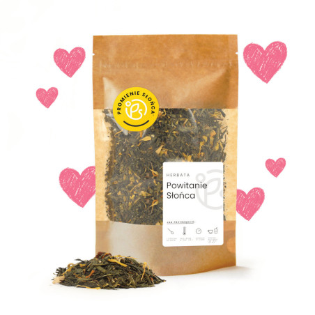 Powitanie Słońca łączy w sobie trzy popularne rodzaje zielonej herbaty: Sencha, Chun Mee oraz Bancha. Wzbogacone są one skórką pomarańczy i kwiatem pomarańczy. Ponadto znajdziemy w niej białą morwę, liofilizowaną morelę, liofilizowaną pigwę, kwiat słonecznika i nagietka. Taka kompozycja to prawdziwe Słońce w Twojej filiżance, które Cię pobudzi i dostarczy dawkę dobrej energii.
