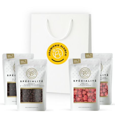 Zestaw prezentowy Promienie Słońca w torbie z logo to wyjątkowa kompozycja owoców zatopionych w czekoladzie, która zachwyci każdego miłośnika słodkości. W zestawie znajdują się cztery eleganckie smakołyki: