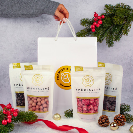 Całość zapakowana jest w elegancką torbę prezentową z logo Promienie Słońca, co sprawia, że zestaw świetnie sprawdza się jako gotowy upominek na każdą okazję.