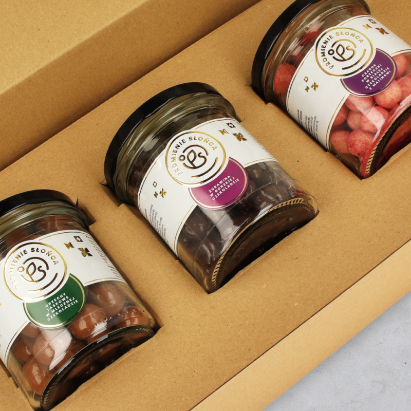 Wewnątrz naszego pudełka znajdziesz trzy słoiczki, skrywające pyszne skarby! Są w nich: orzechy laskowe w mlecznej czekoladzie w słoiczku, żurawina w gorzkiej czekoladzie w słoiczku oraz liofilizowane czarne porzeczki w białej czekoladzie z malinami w słoiczku.