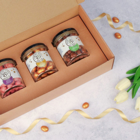 To piękne pudełko skrywa wewnątrz trzy słoiczki z pysznościami. Liofilizowane czarne porzeczki w białej czekoladzie z malinami mają 120 gramów, natomiast złote migdały w białej czekoladzie ze słonym karmelem i pistacje w mlecznej czekoladzie mają po 180 gramów. Wygodne słoiczki można później wykorzystać na przykład do domowych przetworów.