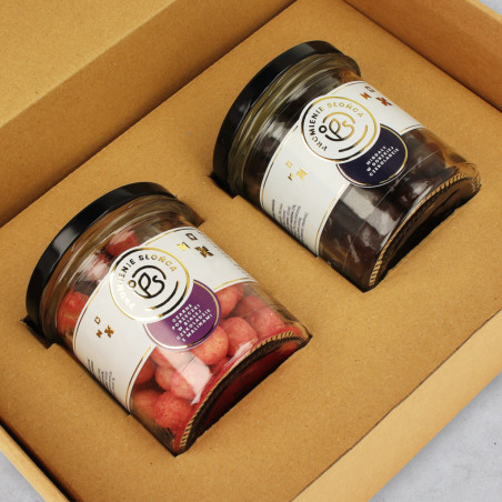 To piękne pudełko skrywa wewnątrz dwa słoiczki z pysznościami. Liofilizowane porzeczki w białej czekoladzie z malinami w słoiczku mają 120 gramów, natomiast migdały w gorzkiej czekoladzie to 180 gramów. Wygodne słoiczki można później wykorzystać na przykład do domowych przetworów.