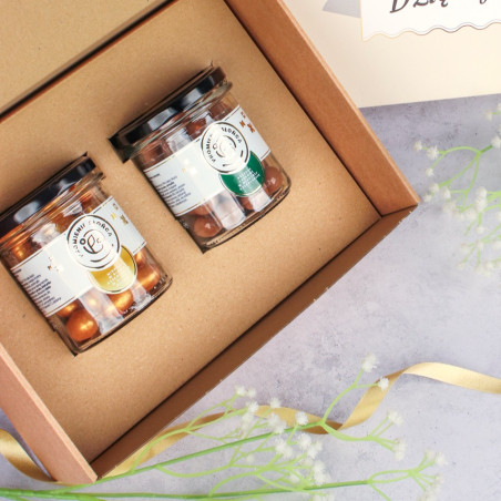Wewnątrz naszego pudełka znajdziesz dwa słoiczki, skrywające pyszne skarby! W jednym są orzechy laskowe w mlecznej czekoladzie w słoiczku natomiast w drugim złote migdały w białej czekoladzie ze słonym karmelem w słoiczku.