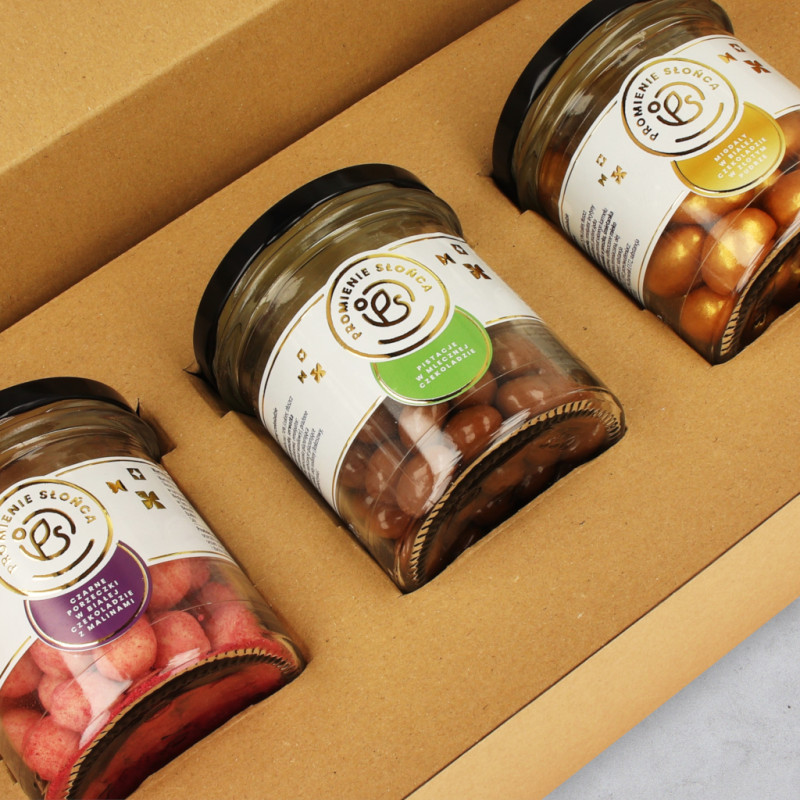 Wewnątrz naszego pudełka znajdziesz trzy słoiczki, skrywające pyszne skarby! Są w nich liofilizowane czarne porzeczki w białej czekoladzie z malinami w słoiczku, złote migdały w białej czekoladzie ze słonym karmelem w słoiczku oraz pistacje w mlecznej czekoladzie w słoiczku.
