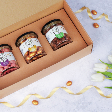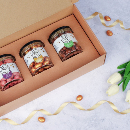 To piękne pudełko skrywa wewnątrz trzy słoiczki z pysznościami. Liofilizowane czarne porzeczki w białej czekoladzie z malinami mają 120 gramów, natomiast złote migdały w białej czekoladzie ze słonym karmelem i pistacje w mlecznej czekoladzie mają po 180 gramów. Wygodne słoiczki można później wykorzystać na przykład do domowych przetworów.