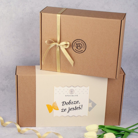 Urocze pudełko, skrywające wewnątrz słoiczki z pysznościami. Porzeczki oraz migdały otoczone najlepszym rodzajem czekolady, rozpływają się w ustach! Zestaw Dobrze, że jesteś! jest nie tylko pyszny, ale i praktyczny. Piękne opakowanie może stanowić ozdobę wystroju, a wygodne słoiczki warto później wykorzystać.