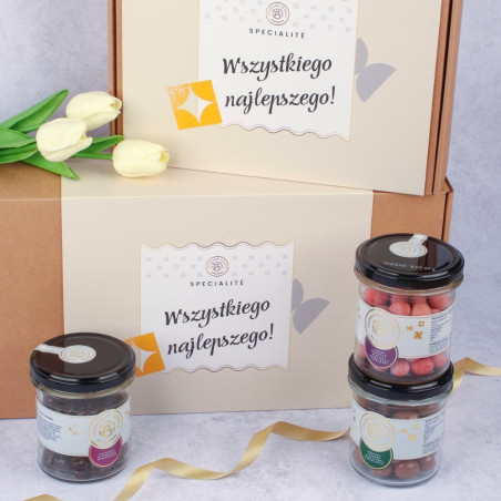 Liofilizowane czarne porzeczki w białej czekoladzie z malinami w słoiczku 120 g