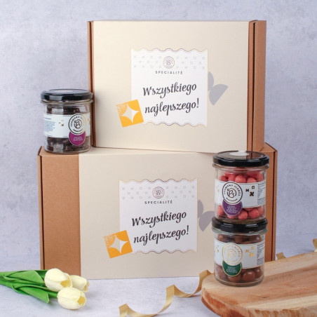 Urocze pudełko, skrywające wewnątrz słoiczki z pysznościami. Porzeczki oraz migdały otoczone najlepszym rodzajem czekolady, rozpływają się w ustach! Zestaw Wszystkiego Najlepszego! jest nie tylko pyszny, ale i praktyczny. Piękne opakowanie może stanowić ozdobę wystroju, a wygodne słoiczki warto później wykorzystać.