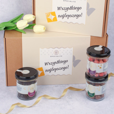 Zestaw Wszystkiego Najlepszego! jest świetną opcją prezentową w ramach Dnia Matki czy na urodziny lub z jakiejkolwiek innej okazji, a nawet bez okazji. Urocze opakowanie i trzy rodzaje słodkości z pewnością nie zawiodą, szczególnie jeśli lubisz bakalie w czekoladzie.