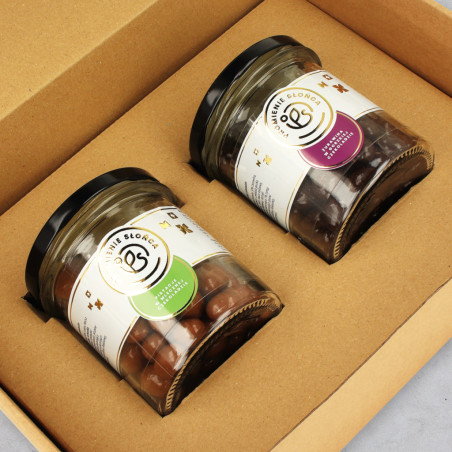 To piękne pudełko skrywa wewnątrz dwa słoiczki z pysznościami. Pistacje w mlecznej czekoladzie mają 180 gramów, natomiast żurawina w gorzkiej czekoladzie 200 gramów. Wygodne słoiczki można później wykorzystać na przykład do domowych przetworów.
