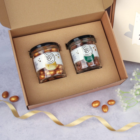 Wewnątrz naszego pudełka znajdziesz dwa słoiczki, skrywające pyszne skarby! W jednym są orzechy laskowe w mlecznej czekoladzie w słoiczku natomiast w drugim złote migdały w białej czekoladzie ze słonym karmelem w słoiczku.