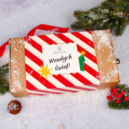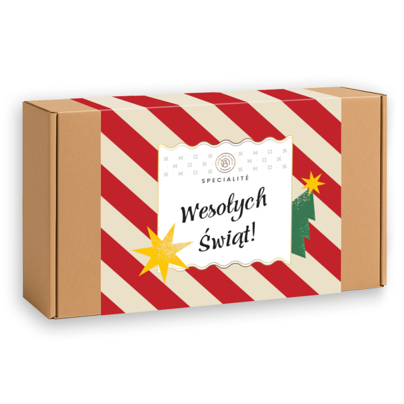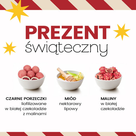 W świątecznym zestawie znalazły się trzy wyjątkowe produkty, które łączą w sobie naturalną słodycz, owocową lekkość i delikatność białej czekolady. To maliny w białej czekoladzie, które zachwycają połączeniem intensywnego, kwaskowego smaku owoców z kremową, subtelną słodyczą. Obok nich znajduje się liofilizowane czarne porzeczki w białej czekoladzie z malinami – kompozycja pełna aromatu i koloru, w której czekolada otula owoce zachowujące swoją świeżość i chrupkość. Całość dopełnia miód nektarowy lipowy, o delikatnym, kwiatowym aromacie i złocistym odcieniu, będący esencją natury i lata zamkniętą w słoiku.