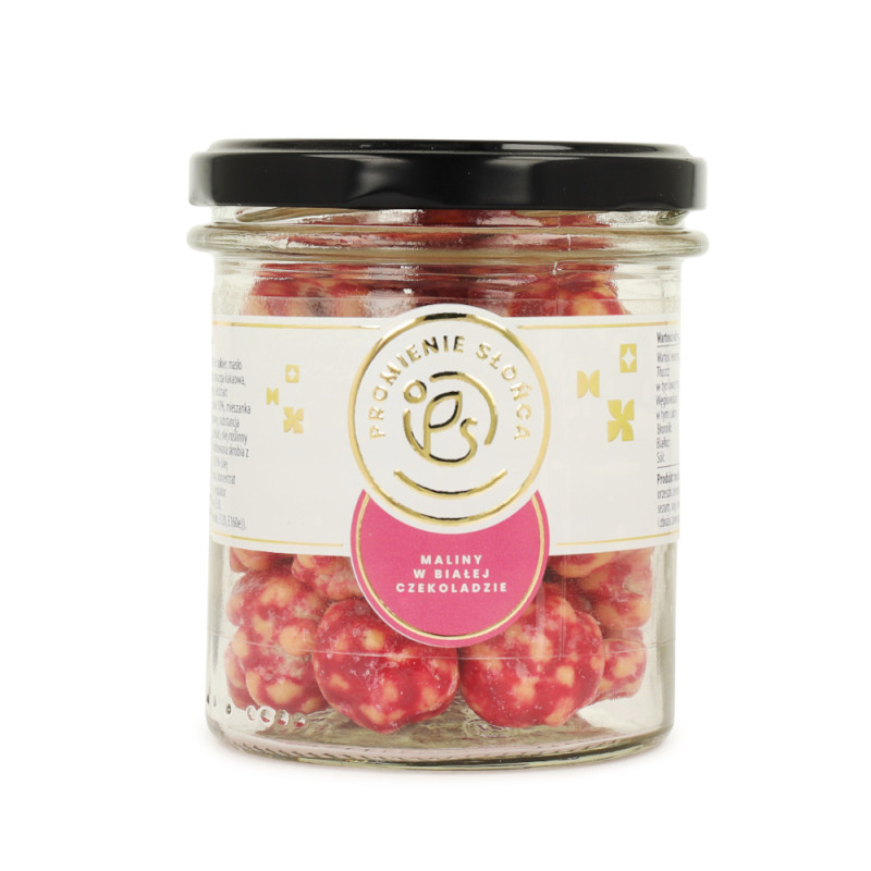 Składniki: biała czekolada 88,95 % (cukier, masło kakaowe, mleko w proszku, miazga kakaowa, emulgator: lecytyna sojowa, ekstrakt waniliowy), maliny liofilizowane 10%, mieszanka glazurująca 1% (syrop glukozowy, substancja glazurująca (guma arabska, szelak), olej roślinny (kokosowy, rzepakowy), modyfikowana skrobia z tapioki, barwnik spożywczy 0,05% (olej słonecznikowy, maltodekstryna, koncentrat buraczany, emulgator E472c, regulator kwasowości: kwas cytrynowy E330, przeciwutleniacz: E307, barwnik: E120, E160e)).